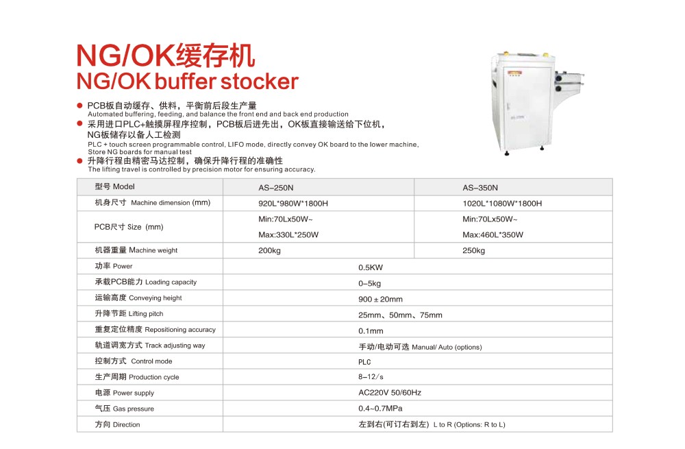 NG/OK緩存機介紹:PCB板自動緩存、供料,平衡前后段生產(chǎn)量;采用進口PLC+觸摸屏程序控制,PCB板后進先出,OK板直接輸送給下位機,NG板儲存以備人工檢測;升降行程由精密馬達控制,確保升降行程的準(zhǔn)確性;