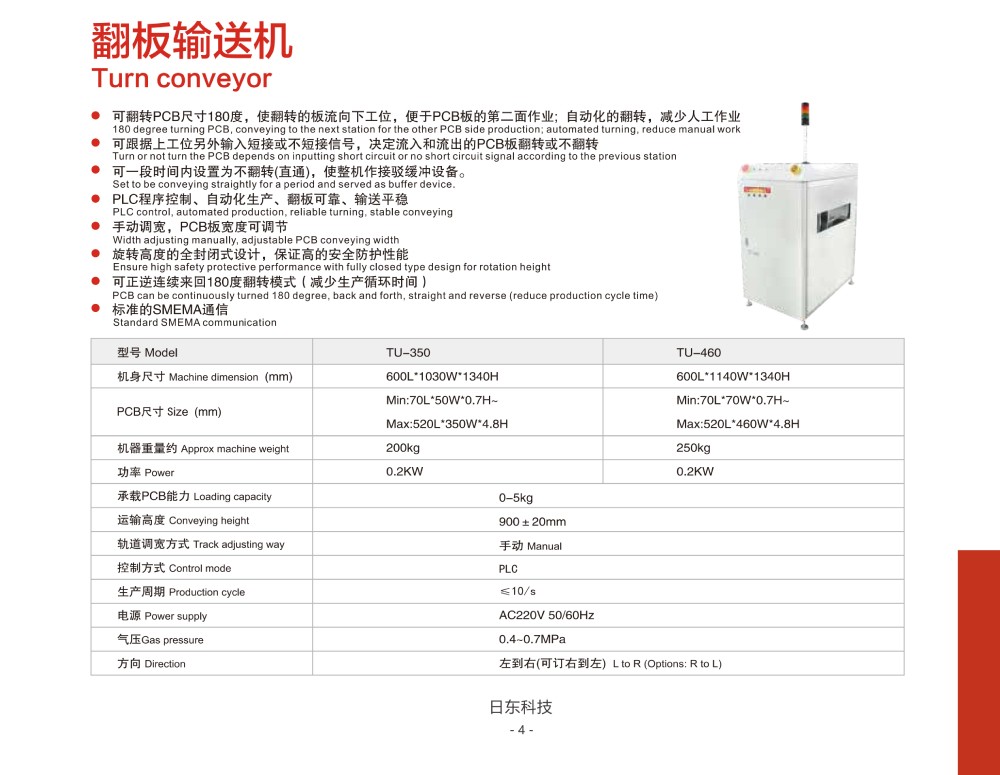 可翻轉PCB尺寸180度, 使翻轉的板流向下工位, 便于PCB板的第二面作業(yè); 自動化的翻轉, 減少人工作業(yè);
