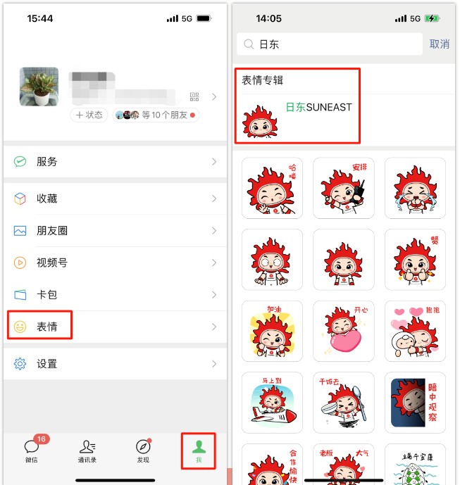 第一步:點(diǎn)擊“我”,搜過表情“日東”