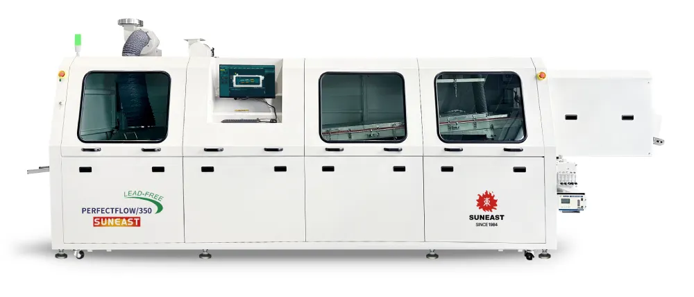 日東科技PERFECTFLOW系列隧道式全程密封氮氣波峰焊,采用全球首創(chuàng)的焊接區(qū)密封解決方案和創(chuàng)新的分段傳輸方案,解決了常規(guī)隧道式波峰焊的分段輸送卡板、調(diào)寬卡頓及使用操作維護不便等問題。消除波峰與錫面落差大的不良影響,將波峰焊接氮氣保護工藝的應用效果發(fā)揮到極致,極大地提升了隧道式波峰焊設(shè)備性能和焊接工藝品質(zhì)。