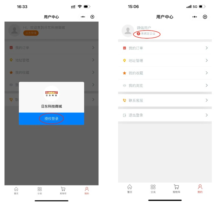 進入首頁需先點擊-我的-點擊登錄-授權登錄 –綁定企業(yè),完善企業(yè)資料。詳細操作如下圖所示: