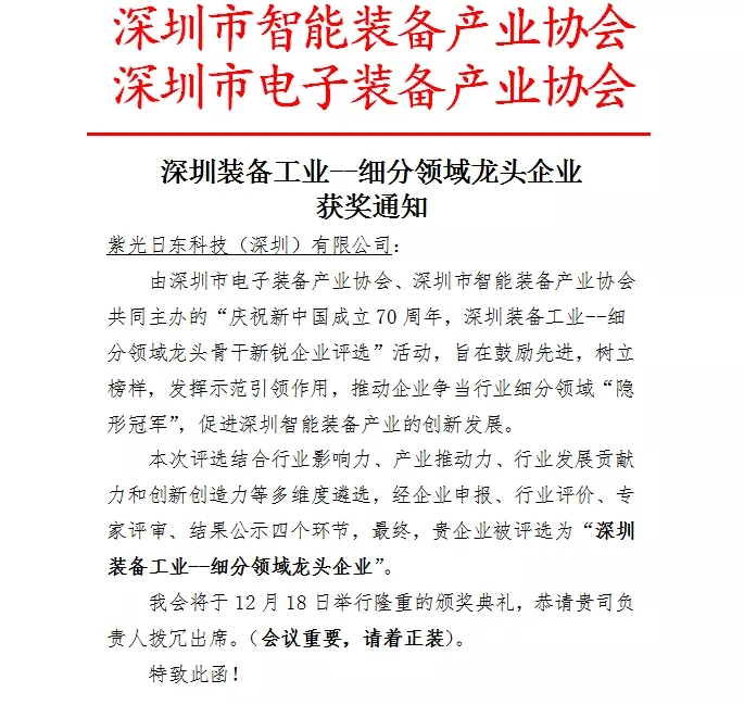 2019年12月18日,由深圳市電子裝備產(chǎn)業(yè)協(xié)會、深圳市智能裝備產(chǎn)業(yè)協(xié)會主辦的“深圳裝備工業(yè)—細分領(lǐng)域龍頭骨干新銳企業(yè)”評選活動,在深圳市福田區(qū)會展中心舉行盛大的頒獎典禮,經(jīng)過組委會的層層篩選,日東科技在本次評選中獲得了細分領(lǐng)域”龍頭企業(yè)“的殊榮!