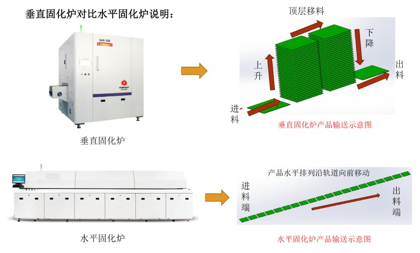 和水平固化爐相比,相同產(chǎn)能下,水平固化爐(產(chǎn)品水平排列存儲)的長度是垂直爐(產(chǎn)品垂直方向存儲)的十多倍甚至更多。