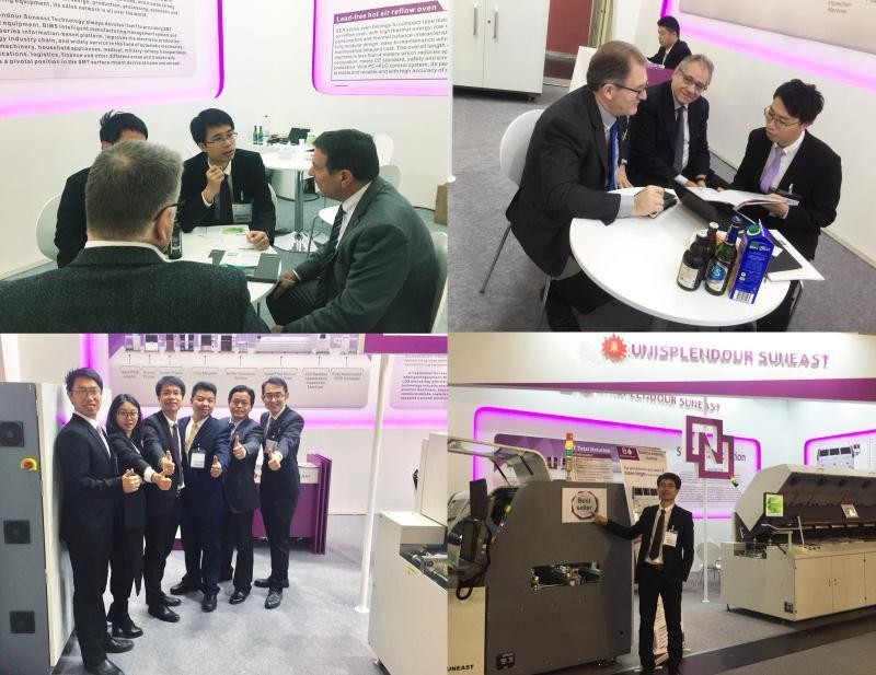 2017年11月14日至17日,Productronica2017在德國慕尼黑新國際博覽中心舉行。日東科技攜選擇性波峰焊SUNFLOW3、無鉛回流焊SER706A、全自動(dòng)錫膏印刷機(jī)SL120亮相Productronica2017展。