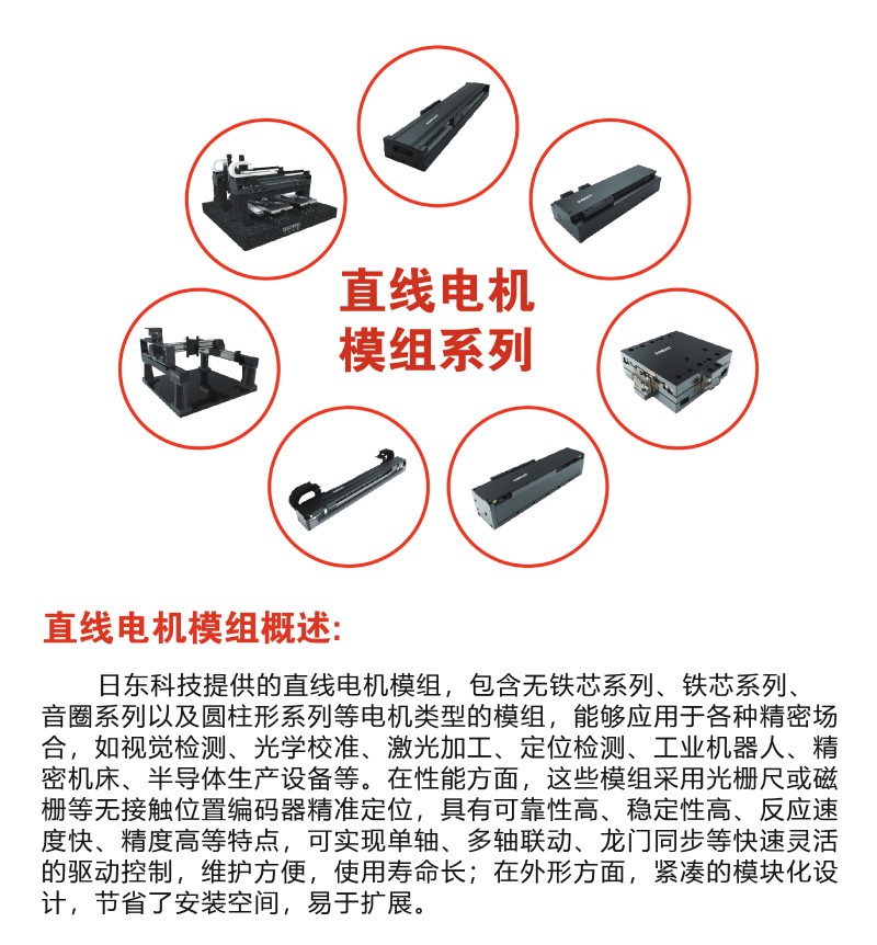 日東科技自主研發(fā)的直線電機產品系列,集高精度(100納米重復定位精度)、高響應速度、高穩(wěn)定性及可靠性等優(yōu)點,廣泛應用于各行業(yè)精密場合,如視覺檢測、光學校準對位、激光加工、工業(yè)機器人、精密機床等。產品采用光柵尺或磁柵等無接觸位置編碼器精準定位,可實現單軸、多軸聯(lián)動,龍門同步等快速靈活的驅動控制,維護方便,使用壽命長,同時緊湊的模塊化設計節(jié)省了安裝空間,易于擴展。