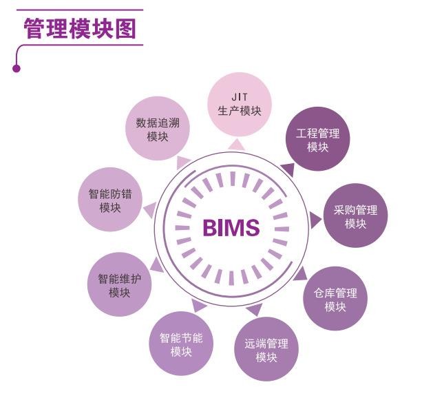 BIMS系統(tǒng)以模塊化的方式提供了一系列獨特的管理工具及方法,可重構(gòu)生產(chǎn)管理系統(tǒng)或制造執(zhí)行系統(tǒng)。自主研發(fā)的快速重構(gòu)機制,可根據(jù)客戶業(yè)務(wù)需求,系統(tǒng)各模塊可靈活組裝并深度定制。可快速添加新功能,使BIMS系統(tǒng)更好的延展。從基本功能架構(gòu)上看,BIMS系統(tǒng)的主要功能包括:JIT生產(chǎn)、數(shù)據(jù)追溯。智能防錯、智能維護、智能節(jié)能、遠端管理、倉庫管理、采購管理和工程管理。實際的客戶系統(tǒng)詳細功能因需定制,與標準的功能架構(gòu)有所偏差。
