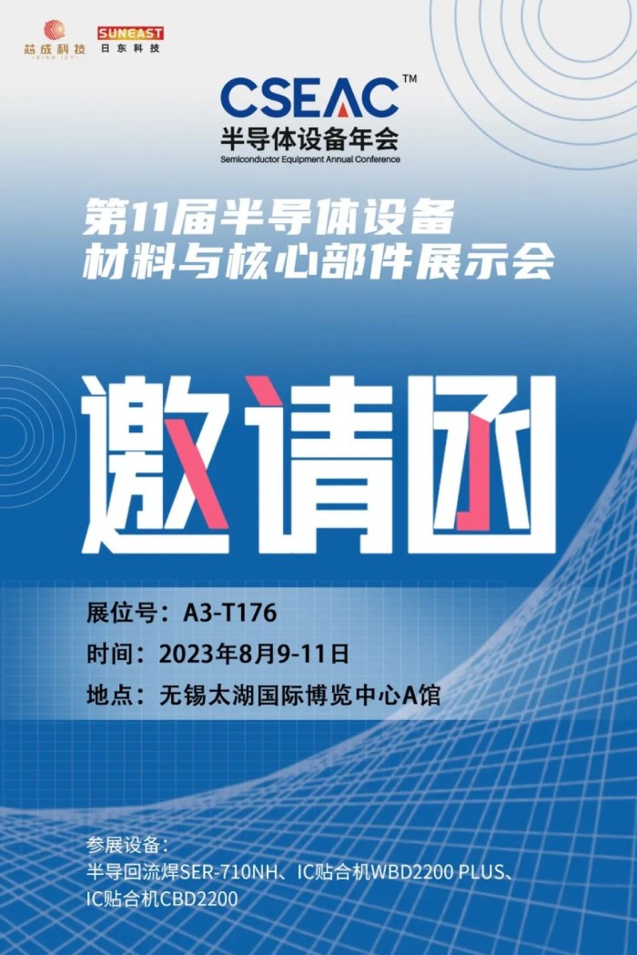 日東科技受邀參加本屆展會,將展出半導體專用回流焊、半導體封裝設備“IC貼合機”,并在8月10日上午的專題活動:新品發(fā)布專場,進行IC貼合機的新產(chǎn)品發(fā)布,歡迎您蒞臨日東展臺和新品發(fā)布會場,與我們面對面溝通交流!