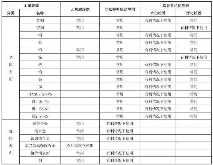 ?、谟欣麠l件下使用:在表面無嚴(yán)重的銹膜或類似的污染時(shí),可用水白松香助焊劑。通常這類金屬表面可用活化松香或非松香有機(jī)材料助焊劑進(jìn)行焊接。