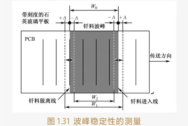 ?、蹨y試方法:將波峰高度調節(jié)至正常工作的高度H0上,然后將帶刻度的石英玻璃平板裝夾在傳送鏈上,將其運行至釬料波峰上調節(jié)好浸入深度,如圖131所示。觀測由于波峰高度的波動而導致玻璃平板上釬料波峰的進入線和脫離線之間闊度的變化[W2(Wo-2△)-Wo-W1(W0+2△)]。