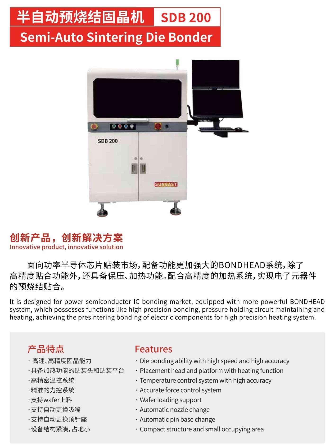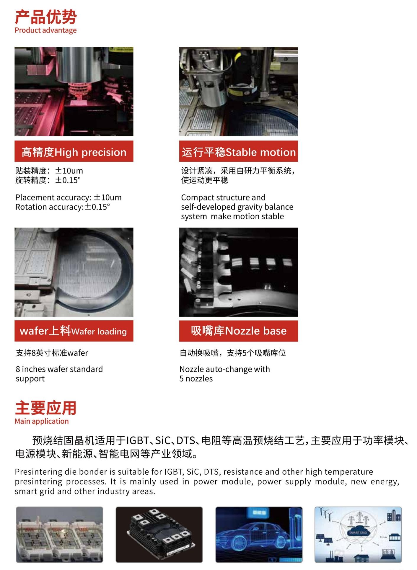 預(yù)燒結(jié)貼合機(jī)面向功率半導(dǎo)體芯片貼裝市場(chǎng),配備功能更加強(qiáng)大的BONDHEAD系統(tǒng),除了高精度貼合功能外,還具備保壓、加熱功能。配合高精度的加熱系統(tǒng),實(shí)現(xiàn)電子元器件的預(yù)燒結(jié)貼合。