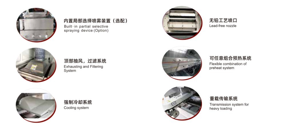 預(yù)熱系統(tǒng):優(yōu)化微熱風(fēng)循環(huán)路徑,溫區(qū)內(nèi)溫度更均勻穩(wěn)定;噴霧抽風(fēng)系統(tǒng):采用全新理念,分體式設(shè)計(jì),維護(hù)保養(yǎng),方便快捷;內(nèi)置局部選擇噴霧裝置(選配):是步進(jìn)電機(jī)通過同步帶及滾珠絲桿,直線導(dǎo)軌等作X和Y方向的運(yùn)動(dòng)來實(shí)現(xiàn)局部選擇噴涂助焊劑。