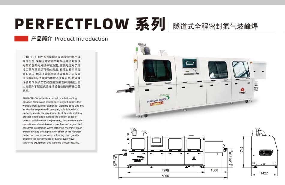 PERFECTFLOW 系列隧道式全程密封氮氣波峰焊,采用全球首創(chuàng)的焊接區(qū)域密封解決方案和創(chuàng)新的分段傳輸方案,完美地應(yīng)對了焊接工藝角度靈活可調(diào)的需求,板底過板空間加大的需求,解決了常規(guī)隧道式波峰焊的分段輸送卡板問題,使用操作維護不便等問題,將波峰焊接氮氣保護工藝的應(yīng)用效果發(fā)揮到極致,極大地提升了隧道式波峰焊設(shè)備性能和焊接工藝品質(zhì)。